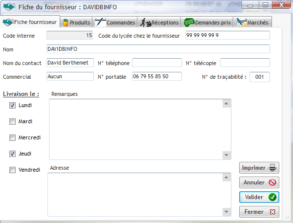 Cette fenêtre affiche la fiche d'un fournisseur. On peut y consulter : - Les informations générales.