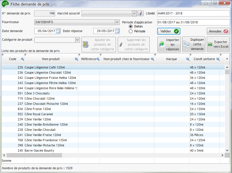 Cette fenêtre affiche une demande de prix à un fournisseur. Cette demande de prix peut-être ponctuelle ou être liée à un appel d'offres (MAPA ou marché groupe par exemple) Cette demande est associée à une période d'application afin de masquer dans les fiches produits ou dans les commandes les produits ayant un tarif n'étant plus valable. Les produits peuvent être ajoutés dans cette demande soit manuellement, soit par catégorie complète (dans le cas des appels d'offres notamment).