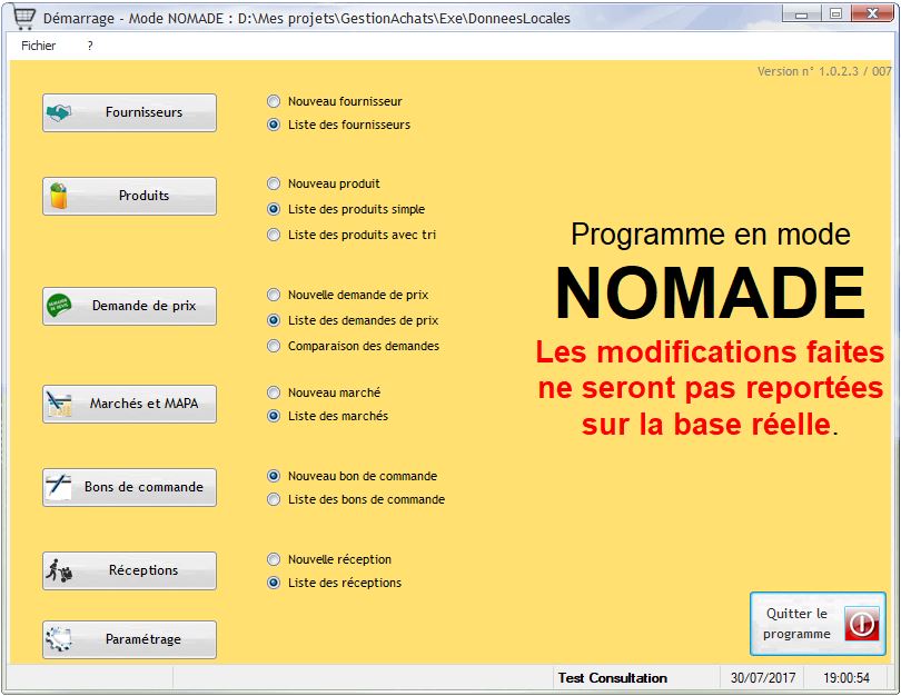 Cette fenêtre est la page d'accueil du programme permettant d'accèder à toutes les fontionnalités disponibles. Dans la copie d'écran ci-dessous, le programme n'est pas connecté au réseau et le programme est automatiquement en mode "Nomade". Dans ce mode servant aux tests et à la consultation, les données sont en local (clé USB par exemple). Le fond de page de la fenêtre change de couleur, et un message s'affiche pour éviter que le client ne réalise des modifications qu'il souhaiterait voir dans les données stockées sur le réseau. On pourrait envisager un mode nomade où les données seraient synchronisées lors de la connexion au réseau, mais ce n'était pas le besoin du client pour ce programme. |