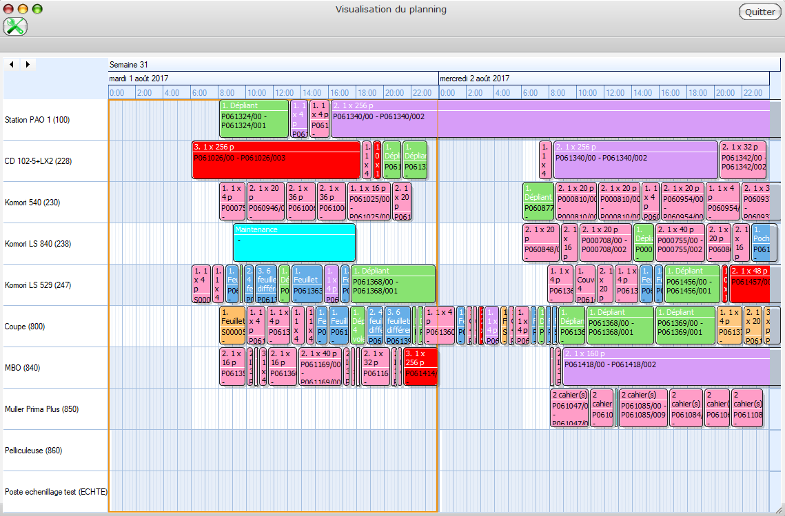 L'utilisateur peut choisir les postes de production qu'il veut afficher, la période d'affichage (1 jour, 2 jours, la semaine ...) et les couleurs associées aux tâches du planning (en fonction du produit associé au dossier de fabrication).